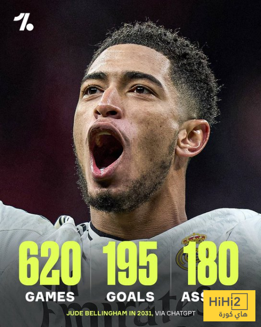 الذكاء الاصطناعي كشف عن ارقام قياسية سيحققها بيلينغهام خلال السنوات الست المقبلة بقميص ريال مدريد، فبحلول عام 2031 سيصل جود الى 620 مباراة في مسيرته مسجلا 195 هدف وصانعا 180.