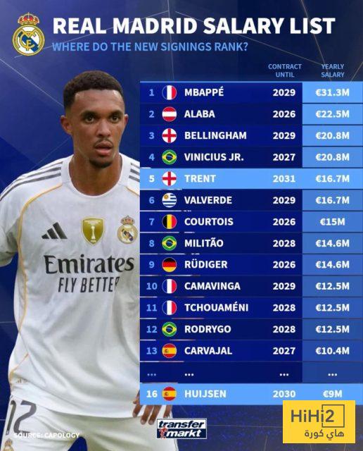 وبحسب موقع “ترانسفير ماركت” فإن فينيسيوس يحتل المركز الثالث بالتساوي مع جود بيلينغهام براتب سنوي يقدر ب 20.8 مليون يورو، فيما يتزعم القائمة كيليان مبابي ب 22.5 مليون يورو، والمفاجأة هي ديفيد ألابا الذي يحتل المركز الثاني ب 22.5 مليون يورو.