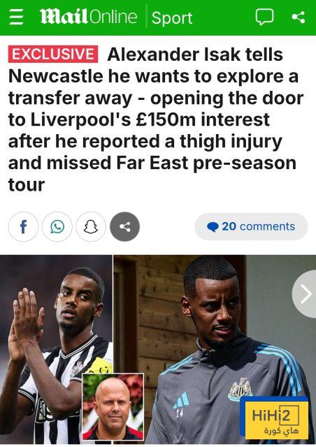 إيزاك لم يسافر مع الفريق في جولته التحضيرية إلى سنغافورة، بعد تعرضه لإصابة في الفخذ، لكن مصادر الصحيفة تؤكد أن السبب الحقيقي يعود إلى موقفه من مستقبله.