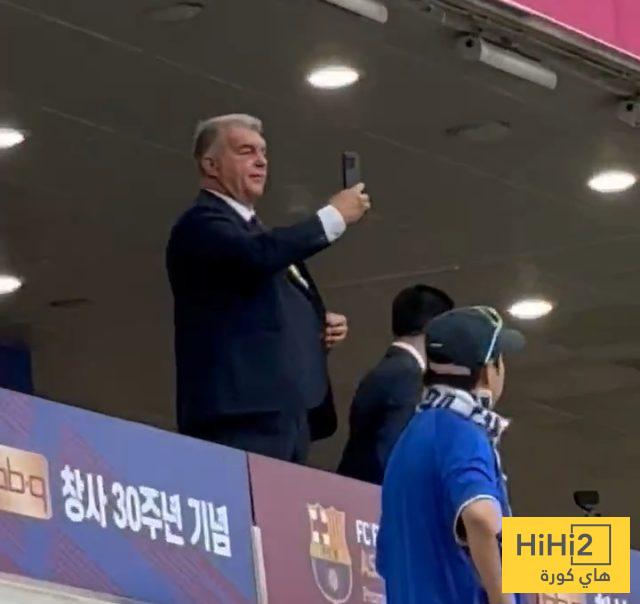 خوان لابورتا رئيس نادي برشلونة يؤازر الفريق أمام سيؤول من المدرجات رفقة البعض من مجلس الإدارة.