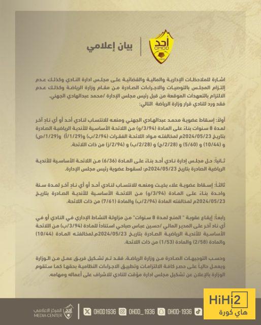 جاء ذلك بسبب مخالفات للائحة الأساسية للأندية، والملاحظات الإدارية والمالية، وعدم الالتزام بالتوصيات والإيفاء بالتعهدات.