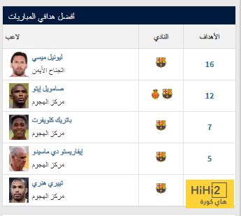 وجاء المهاجم السابق صامويل إيتو في المركز الثاني برصيد 12 هدفًا، سجلها خلال فترتيه مع برشلونة وريال مايوركا، فيما حل باتريك كلويفرت في المركز الثالث برصيد 7 أهداف.
