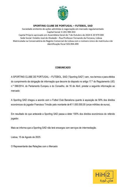 وبناءً على ذلك، أصبح نادي سبورتينغ يمتلك 100% من الحقوق الاقتصادية للاعب المذكور، كما يعلن أن نادي سبورتينغ لن يتحمل أي رسوم متعلقة بخدمات الوساطة.”