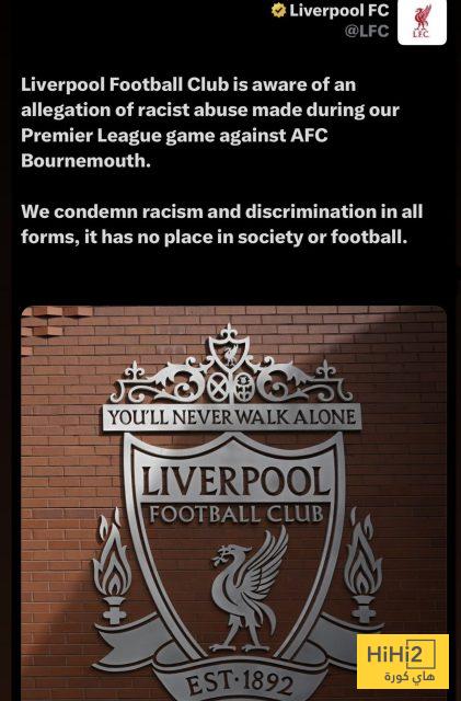 وجاء في البيان: “يُدرك نادي ليفربول وجود مزاعم عن إساءة عنصرية خلال مباراتنا أمام بورنموث.”