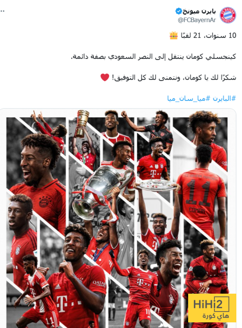 البافاري كتب عبر حسابه الرسمي على منصة “إكس”: “10 سنوات، 21 لقبًا، شكرًا لك يا كومان، ونتمنى لك كل التوفيق”.