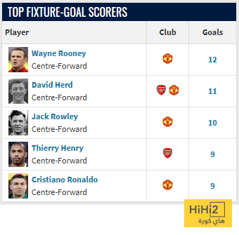 وبحسب موقع ترانسفير ماركت، فقد استطاع واين روني أسطورة اليونايتد من اعتلاء صدارة قائمة الهدافين بتسجيله 12 هدفاً في مرمى الجانرز بكل البطولات.
