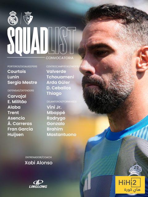 هاي كورة – أعلن المدرب الإسباني تشابي ألونسو، عن قائمة ريال مدريد الرسمية لمواجهة أوساسونا، غدًا الثلاثاء، على ملعب سانتياغو برنابيو، ضمن منافسات الجولة الأولى من بطولة الدوري الإسباني.