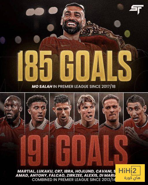 محمد صلاح سجل 185 هدفا في الدوري الانجليزي الممتاز منذ انتقاله الى الانفيلد رود بينما سجل مهاجمي مانشستر يونايتد 191 هدفا منذ الموسم 2013-2014 أي ان صلاح يتفوق لوحده على كل مهاجمي اليونايتد .