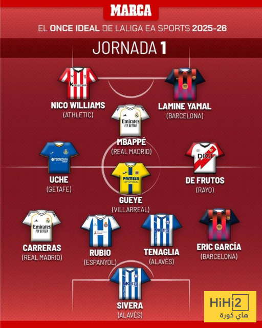 صحيفة الماركا كشفت عن التشكيلة المثالية للجولة الاولى في الليغا والتي شهدت تواجد ثنائي الريال كيليان مبابي والفارو كاريراس ، مقابل لاعبين من البارسا وهما لامين يامال واريك غارسيا.