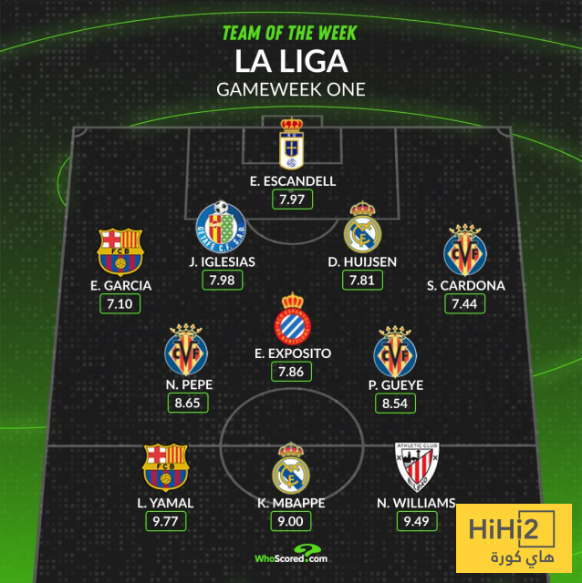 و حصل لامين يامال على التقييم الاعلى في التشكيلة المثالية للجولة الاولى باللغيا (9.77 ) متفوقا على نجم الريال كيليان مبابي الذي بلغ تقييمه 9.00.
