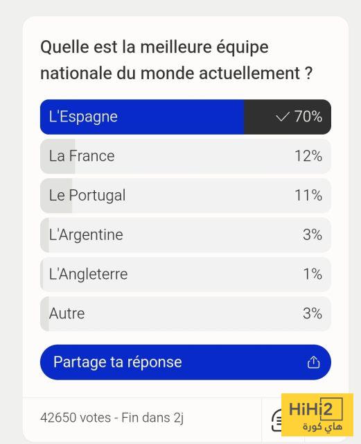 وبتلك المناسبة، نشر موقع فوت ميركاتو الفرنسي استطلاع رأي لجمهوره حول المنتخب صاحب الأداء الأفضل حاليًا، فجاء المنتخب الإسباني في المقدمة بفارق كبير عن ملاحقيه، حيث حصل على نسبة 70% من الأصوات.