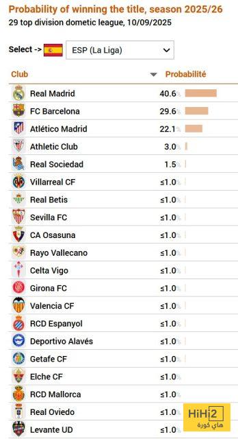 هاي كورة: كشف المركز الدولي للدراسات الرياضية CIES عن توقعاته لموسم الليغا، معطياً الريال مدريد فرصة 40.6% للتتويج باللقب، بينما جاء برشلونة في المركز الثاني بنسبة 29.6% فقط.