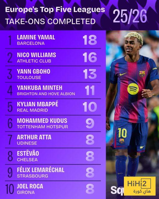ووفقًا لإحصاءات Squawka، أتم يامال 18 مراوغة ناجحة حتى الآن، متفوقًا بفارق ضئيل على زميله الدولي نيكو ويليامز من نادي أتليتك بلباو، الذي سجل 16 مراوغة.