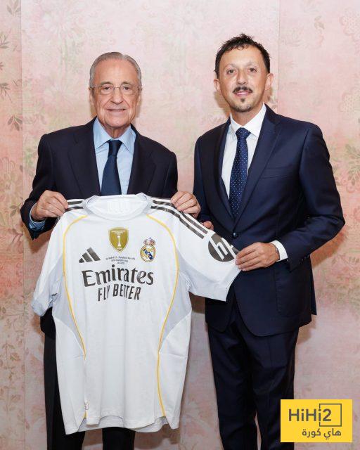 قدم فلورنتينو بيريز رئيس نادي ريال مدريد قميص الأبيض كهدية لرئيس مارسيليا الفرنسي خلال اجتماع الثنائي اليوم.