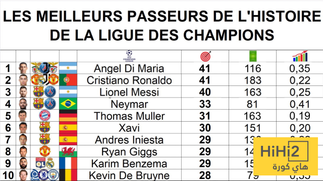 ترتيب اللاعبين العشرة ملوك صناعة الاهداف في تاريخ ابطال اوروبا جاء على النحو التالي :
