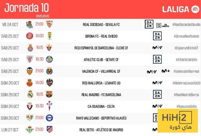 هاي كورة – أعلنت رابطة الدوري الإسباني لكرة القدم عن مواعيد مباريات الجولة العاشرة من الليغا لموسم 2025-2026، والتي ستشهد قمة مرتقبة بين ريال مدريد وبرشلونة.