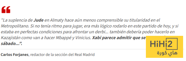 ” استبدال جود بيلينغهام وجلوسه على مقاعد البدلاء في ألماتي يجعل مشاركته كأساسي في ملعب ميتروبوليتانو ضد أتلتيكو أقل وضوحًا. لو لم يكن يمتلك اللياقة البدنية الكافية للعب، لكان من المنطقي منحه الفرصة في مباراة اليوم. أما إذا كان في حالة مثالية لخوض مباراة الأتليتي، لكان بإمكانه المشاركة في كازاخستان أيضًا، كما سيفعل مبابي وفينيسيوس.. بذلك يبدو أن تشابي يعترف بخطئه في الديربي.”