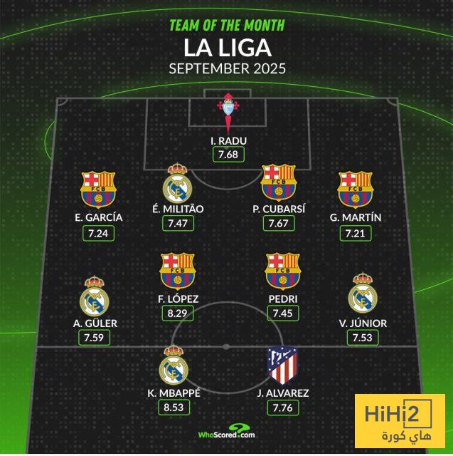 هاي كورة- أعلن موقع هو سكورد عن التشكيلة المثالية للدوري الإسباني في شهر سبتمبر 2025، والتي شهدت تفوقًا واضحًا لبرشلونة بوجود خمسة لاعبين دفعة واحدة، مقابل أربعة لاعبين من ريال مدريد، فيما خطف كيليان مبابي صدارة التشكيلة بعد أدائه الكبير، وجاء جوليان ألفاريز ممثلًا لأتلتيكو مدريد، وإيوان رادو حارس سيلتا فيغو ضمن القائمة.