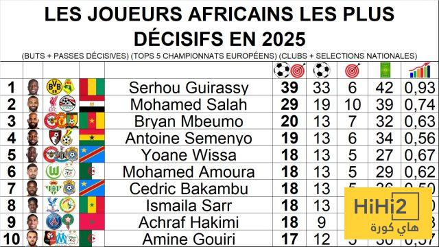 هاي كورة- سجلت قائمة اللاعبين الافارقة العشرة الاكثر مساهمة تهديفية خلال العام 2025 تواجد 4 لاعبين عرب من ثلاث جنسيات مختلفة في مراكز متباينة.