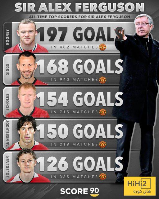 5- الانجليزي واين روني افضل هداف في مسيرة المدرب الاسكتلندي السير اليكس فيرغسون برصيد 197 هدفا في 402 مباراة بألوان مانشستر يونايتد .