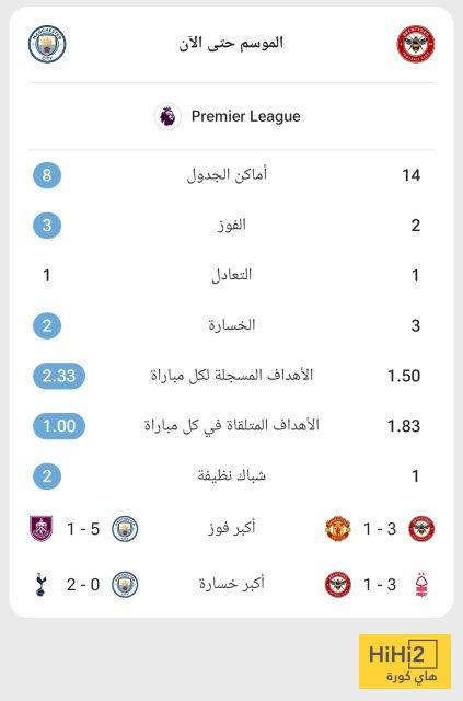 فيما يلي مقارنة بين أرقام السيتي و برينتفورد في الدوري هذا الموسم: