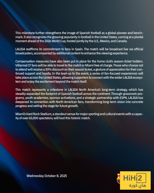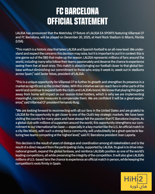 “أعلنت رابطة الدوري الاسباني ان مباراة برشلونة وفياريال في الجولة الـ 17 من الليغا ستقام في 20 ديسمبر 2025 على ملعب هارد روك في ميامي ، فلوريدا بالولايات المتحدة الامريكية .