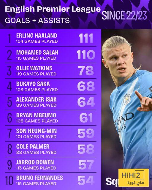 يتصدر إيرلينغ هالاند، مهاجم مانشستر سيتي، القائمة بعد أن ساهم في تسجيل 111 هدفًا خلال 104 مباريات، متفوقًا على محمد صلاح، نجم ليفربول، الذي حل ثانيًا برصيد 110 مساهمات من 115 مباراة.