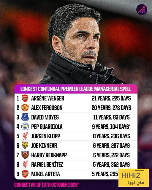 هاي كورة- يحتل المدرب الاسباني ميكيل ارتيتا المدير الفني لنادي ارسنال المركز التاسع في ترتيب المدربين الاكثر بقاء مع نفس النادي في تاريخ الدوري الانجليزي الممتاز .