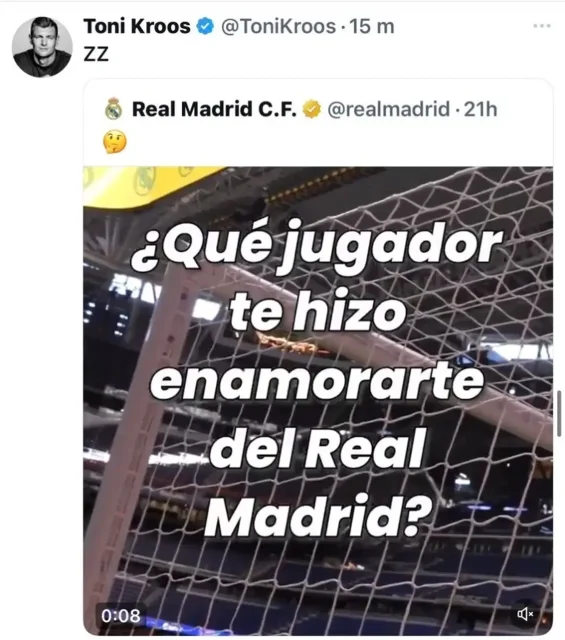 ومن بين آلاف الردود التي انهالت على المنشور، جاء رد من وجه مألوف لجماهير الميرينغي، النجم الألماني توني كروس، الذي كشف أن الأسطورة زين الدين زيدان كان السبب وراء وقوعه في حب ريال مدريد.