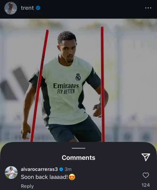 وبحسب التقارير، شارك أرنولد في تدريبات الفريق الأول يوم الأربعاء، وحرص زميله ألفارو كاريراس على الترحيب به بطريقة مميزة، إذ علق على منشور اللاعب على إنستغرام قائلاً: “ستعود قريبًا يا رفيق!”.
