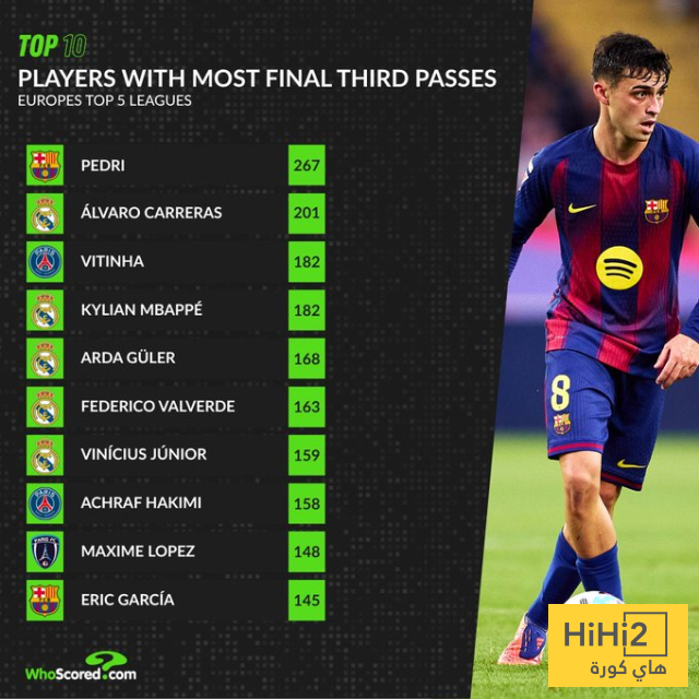 وأظهرت الإحصائية أن عددًا من لاعبي ريال مدريد تواجدوا ضمن قائمة أكثر من قدم تمريرات في الثلث الهجومي بدوريات أوروبا الخمس الكبرى، من بينهم ألفارو كاريراس، كيليان مبابي، أردا غولر، فيديريكو فالفيردي، وفينيسيوس جونيور.