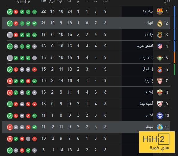 خيتافي في المركز الـ 11 من ترتيب الليغا برصيد 11 نقطة .