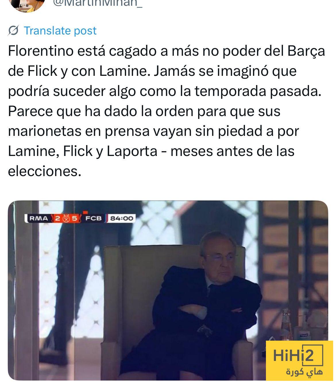 ” فلورنتينو غاضبٌ للغاية من برشلونة بقيادة فليك ولامين. لم يتخيل قط أن يحدث ما يشبه الموسم الماضي. يبدو أنه أعطى الأوامر لدمى إعلامه بمهاجمة لامين وفليك ولابورتا بلا رحمة – قبل أشهر من الانتخابات.”