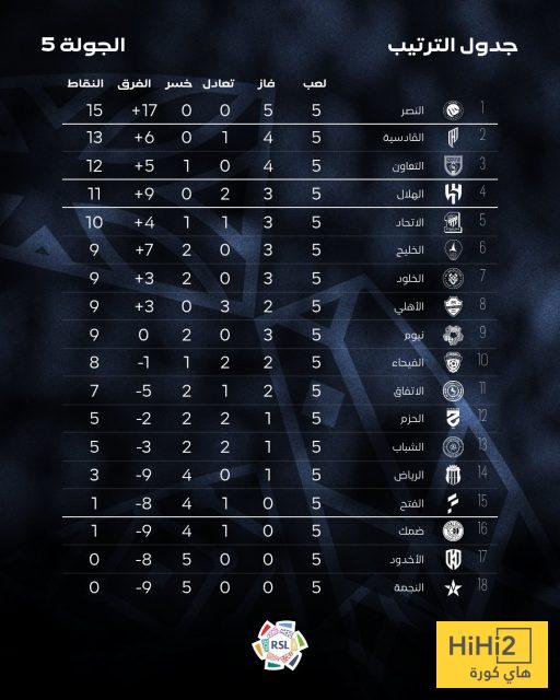 ترتيب الدوري السعودي بعد ختام الجولة الخامسة