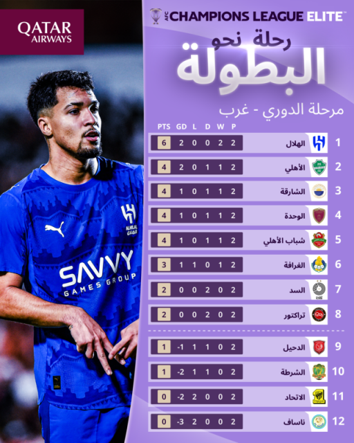 يأتي خلفه مباشرة، الأهلي السعودي، الشارقة والوحدة الإماراتيين، وشباب أهلي دبي، برصيد 4 نقاط لكل منهم، مما يزيد من حدة المنافسة على الصدارة.