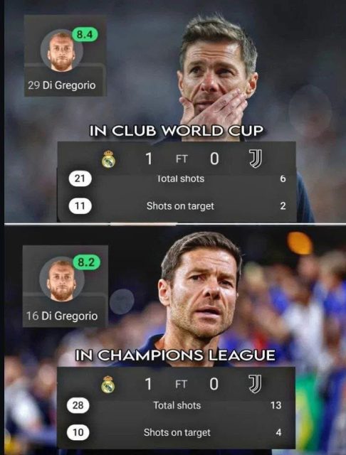 الصورة المرفقة تؤكد تفوق الريال في المباراتين على يوفنتوس من حيث عدد التسديدات ولكن تألق حارس يوفنتوس ، دي غريغوريو، هو ما منع مدريد من الفوز بنتيجة كبيرة .