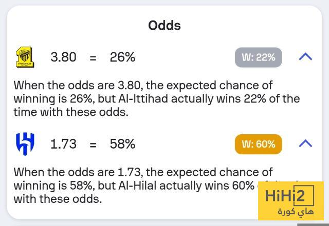 نسبة فوز الهلال تصل إلى 60% ، بينما يمتلك الاتحاد حظوظ تبلغ الـ 22% ، وتظل الـ 18% المتبقية للتعادل.