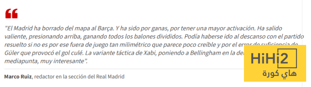 ” لقد محا ريال مدريد برشلونة من على الخريطة. وكان ذلك بفضل رغبتهم في التقدم، ونشاطهم المتزايد. دخلوا بشجاعة، وضغطوا بقوة، مستحوذين على كل كرة. كان بإمكانهم دخول الاستراحة والمباراة محسومة لولا ذلك التسلل الدقيق الذي يبدو لا يُصدق، وخطأ غولر الذي أدى إلى هدف برشلونة.