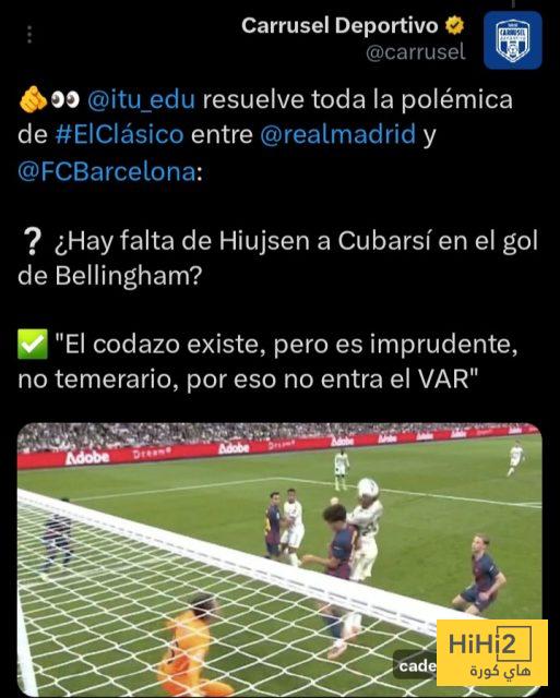 “هل هناك خطأ من هويسين لكوبارسي في هدف بيلينغهام؟ الالتحام موجود، ولكن لا يوجد به تهور، ولهذا السبب لم تتدخل تقنية الفار”.