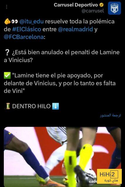 “هل كان قرارًا صحيحًا إلغاء ركلة الجزاء التي تم احتسابها ضد لامين بعد تدخله على فينيسيوس؟ لامين وضع قدمه أمام فينيسيوس، وبالتالي فهي مخالفة من فيني”.