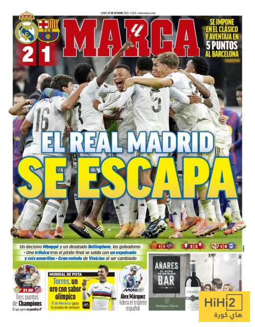 هاي كورة- تصدر فوز ريال مدريد بالكلاسيكو ضد برشلونة غلاف صحيفة ماركا الاسبانية اليوم الاثنين 27 اكتوبر 2025.
