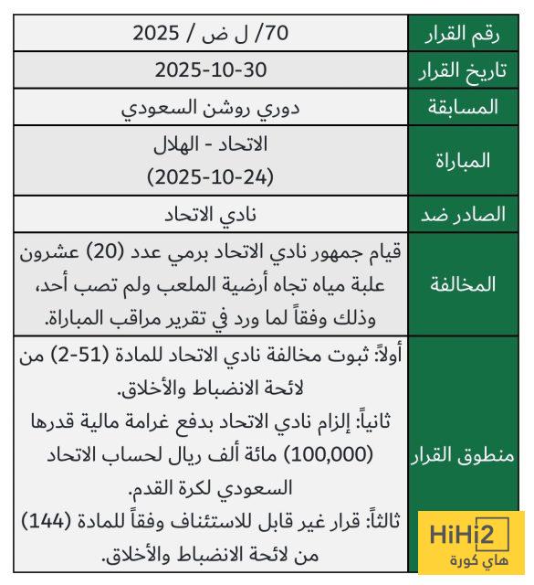 اللجنة قررت تغريم نادي الاتحاد مبلغ 100 ألف ريال، بعد قيام جماهيره برمي 20 علبة مياه تجاه أرضية الملعب، دون أن تُصيب أي شخص.