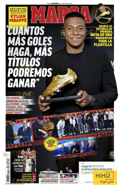 هاي كورة- تصدر كيليان مبابي ، نجم ريال مدريد ، غلاف صحيفة ماركا الاسبانية اليوم السبت 1 نوفمبر 2025 ، بعد تسليمه جائزة الحذاء الذهبي في حفل خاص أقيم ظهر امس .