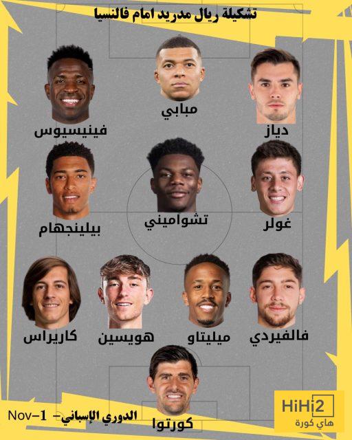 هاي كورة – كشف موقع هاي كورة عن تشكيلة ريال مدريد المتوقعة لمواجهة فالنسيا في الجولة الحادية عشر من الليغا حيث سيلتقي الفريقان مساء اليوم السبت وفق التوقيت المدرج في جداول الموقع لكل دولة حول العالم .