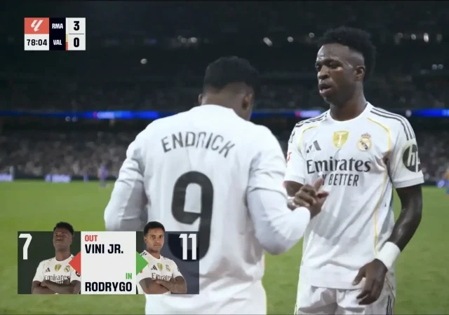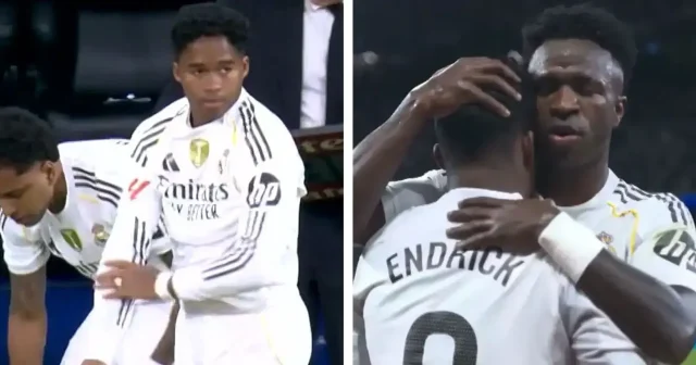 وبينما كان إندريك على وشك الدخول إلى الملعب، شارك فينيسيوس جونيور لحظة لطيفة مع زميله الأصغر سنا، احتضنه فيني قليلاً وقدم له بعض النصائح الإيجابية، قبل أن يصافح ألونسو ويتوجه إلى مقعد البدلاء.
