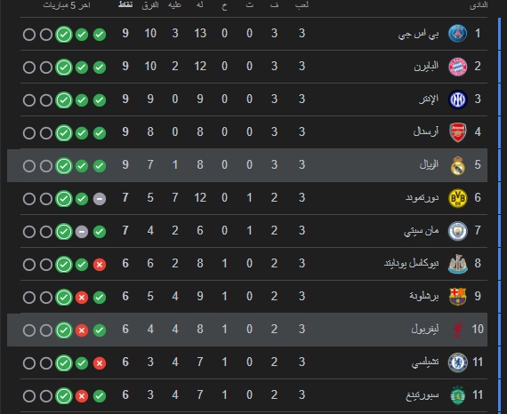 ليفربول في المركز الـ 10 من ترتيب دوري ابطال اوروبا برصيد 6 نقاط .