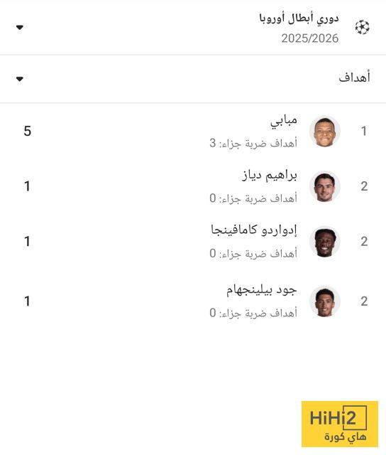 ويتصدر النجم الفرنسي كيليان مبابي قائمة هدافي ريال مدريد في دوري الأبطال هذا الموسم ، حيث سجل 5 أهداف حتى الآن .