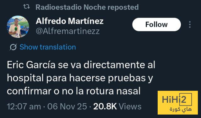 وكتب مارتينيز عبر حسابه على منصة X : ” إيريك غارسيا يتوجه مباشرة إلى المستشفى لإجراء الفحوصات والتأكد من وجود كسر في أنفه أم لا “.