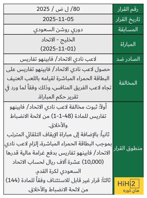 اللجنة قررت تغريم محترف الاتحاد بدفع مبلغ مالي تصل قيمته إلى 10 آلاف ريال ، بسبب تدخله العنيف على لاعب الخليج وحصوله على البطاقة الحمراء المباشرة .