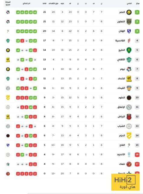 النصر بـ 21 نقطة من أصل 21 ، سجل 23 هدفًا واستقبلت شباكه 3 فقط .